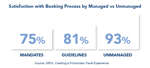 “Choice is a key driver of satisfaction among those who view themselves as happiest with business travel. Those who are able to choose the travel provider (airline, hotel, car rental provider) are significantly more likely to be satisfied than those who are required to use the employer’s preferred vendor.”