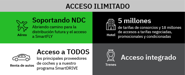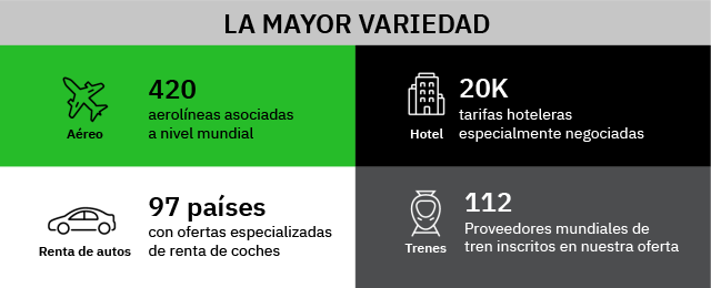 Desde lo último en NDC y tarifas aéreas especialmente negociadas, contenido hotelero agregado y único, hasta ofertas exclusivas en transporte terrestre, tren y servicios auxiliares, lo tenemos todo.