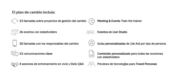 Garantizar la existencia de un proceso efectivo de gestión del cambio para todos los interesados era una prioridad máxima en el proceso de onboarding con FCM. Afortunadamente, FCM pudo aportar una estructura de gestión del cambio bien definida, basada en los principios ADKAR de Prosci, para apoyar el proceso de cambio. Para garantizar una transición fluida, se asignó al proyecto un recurso de gestión del cambio para evaluar la empresa, dimensionar el cambio, revisar el impacto con los interesados y desarrollar la estrategia y el plan de comunicación. Los eventos y las comunicaciones que siguieron se basaron en cada Travel Persona, asegurándose de que supieran por qué se producía el cambio, cómo experimentarían el cambio a lo largo del viaje y cuáles serían las ventajas del cambio. En estrecha colaboración con el equipo de proyectos del cliente, desarrollamos una revisión detallada, un plan y una estrategia en tan solo unas cuantas semanas.