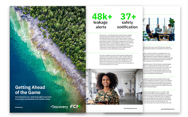 En un principio, nuestro objetivo con esta tecnología era mejorar el cumplimiento de la política de viajes y reducir las fugas para controlar los costes. Gracias a la colaboración con Discovery Inc., nuestra tecnología de soporte a la toma de decisiones evolucionó para incluir información de seguridad, recordatorios de billetes no utilizados, sugerencias sostenibles y mensajes de formación.