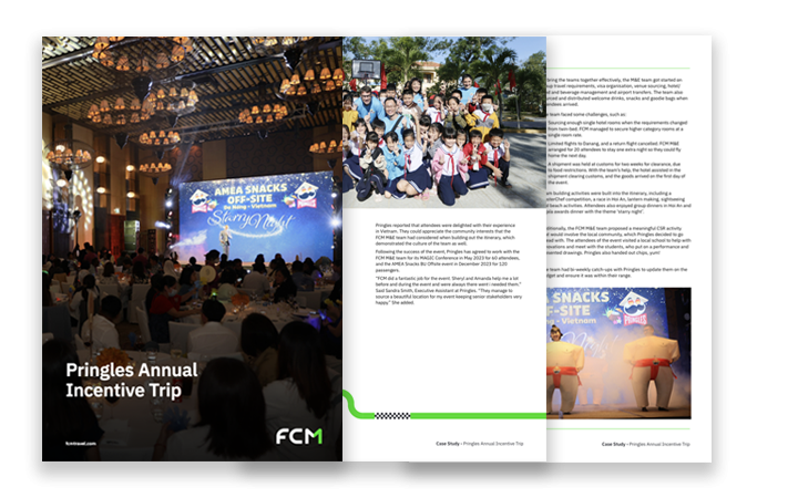 Pringles, ett globalt snacksvarumärke och en del av Kellogg's Company, kontaktade FCM Meetings & Events för att planera deras årliga incentiveresan för medarbetare från Singapore och Enstek-anläggningen i Malaysia. Målet var att diskutera företagets mål för det kommande räkenskapsåret och att belöna medarbetarna.